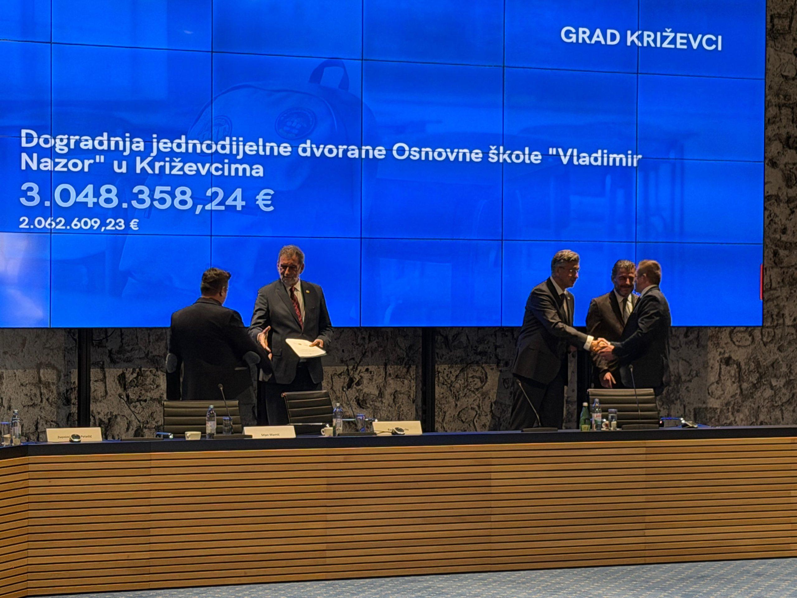 Gradonačelnik Tomislav Katanović je tamo potpisao ugovor za projekt izgradnje i opremanja nove školske sportske dvorane uz Osnovnu školu „Vladimir Nazor“, a isti su gradonačelniku uručili predsjednik Vlade Republike Hrvatske Andrej Plenković i ministar znanosti, obrazovanja i mladih Radovan Fuchs. Ukupna vrijednost projekta iznosi 3.048.358,24 eura, dok je 2.062.609,23 eura bespovratnih sredstava osigurano kroz Nacionalni plan oporavka i otpornosti. Ovaj projekt odobren je u sklopu Poziva na dodjelu bespovratnih sredstava NPOO C3.1. R1-I2.01 – Izgradnja, rekonstrukcija i opremanje osnovnih škola za potrebe jednosmjenskog rada i cjelodnevne škole.