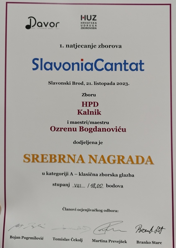 Hrvatsko pjevačko društvo “Kalnik” sudjelovalo je danas na 1. natjecanju Slavonia Cantat u Slavonskom Brodu, u organizaciji Hrvatske udruge zborovođa i osvojilo srebrnu nagradu osmoga stupnja, što je tik do zlatne plakete. Konkurencija je bila iznimno jaka, sudjelovalo je ukupno 19 zborova, klapa i sastava u četiri kategorije, od kojih su neki pjevali i u dvije.