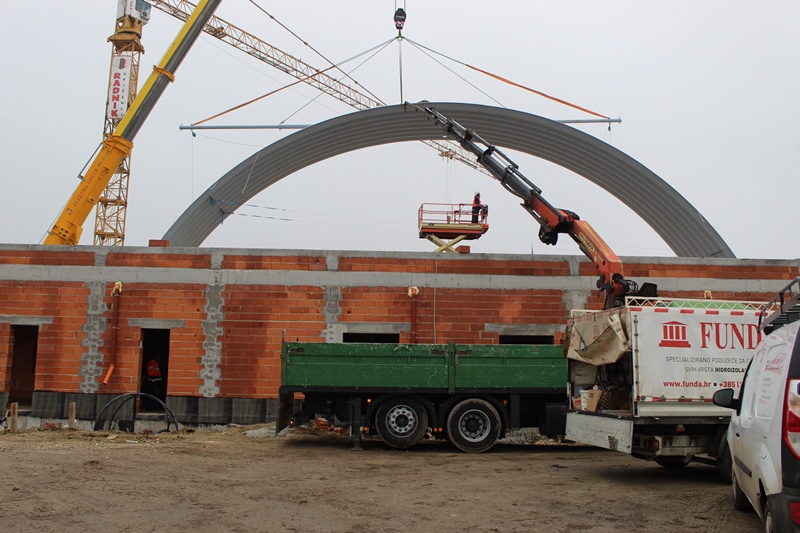 Napreduju radovi na izgradnji nove sportske dvorane kod Osnovne škole Ljudevita Modeca Križevci pa je tako počelo postavljanje krovne polukružne montažne Hupro konstrukcije.