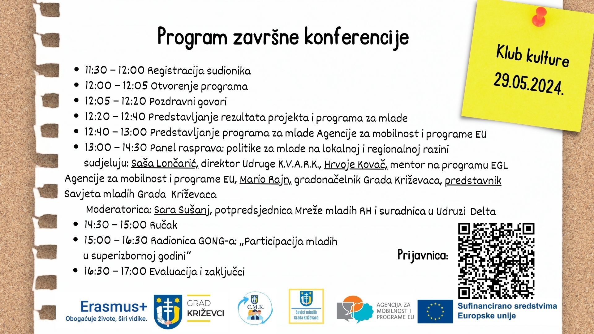 U sklopu završne konferencije održat će se predstavljanje rezultata projekta i Gradskog programa za mlade Grada Križevaca za sljedeće četiri godine. Održat će se i panel rasprava sa zanimljivim govornicima iz područja rada s mladima, a to su: Saša Lončarić, direktor K.V.A.R.K.-a, udruge koja djeluje u radu s mladima i u kulturi na području Križevaca već 25 godina, zatim Hrvoje Kovač, mentor za EGL projekt u Agenciji za mobilnost i programe Europske unije te dugogodišnji aktivist u sektoru mladih prisutan više od 20 godina, gradonačelnik Grada Križevaca Mario Rajn te predstavnik Savjeta mladih Grada Križevaca. Panel raspravu moderirat će Sara Sušanj, potpredsjednica Mreže mladih RH i stručna suradnica u Udruzi Delta iz Rijeke.
