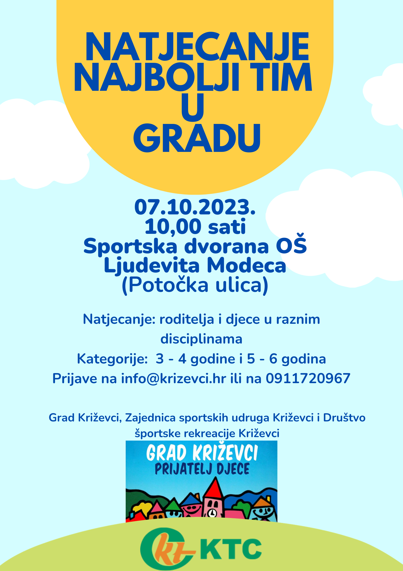Subota, 7. listopada započet će sportskim programom koji će se održati u sportskoj dvorani Osnovne škole Ljudevita Modeca u Potočkoj ulici. U 10,00 sati počinje tradicionalno natjecanje Najbolji tim u gradu u kojem jedan tim roditelj-dijete odmjerava svoje snage s drugim takvim timovima. Natjecanje će se odvijati u dvije kategorije, od 3 do 4 godina te od 5 do 6 godina. U 10,30 sati održat će se još jedna utrka beba u puzanju i to u dvije kategorije, djeca do 12 mjeseci i djeca od 12 do 16 mjeseci starosti. Pozivamo sve roditelje i njihovu djecu da se priključe ovim zabavnim sportskim događanjima, a nagrade za one najbolje osigurala je tvrtka KTC d.d. Svi zainteresirani mogu se prijaviti unaprijed ili pak potražiti dodatne informacije na info@krizevci.hr ili na broj mobitela 0911720967.